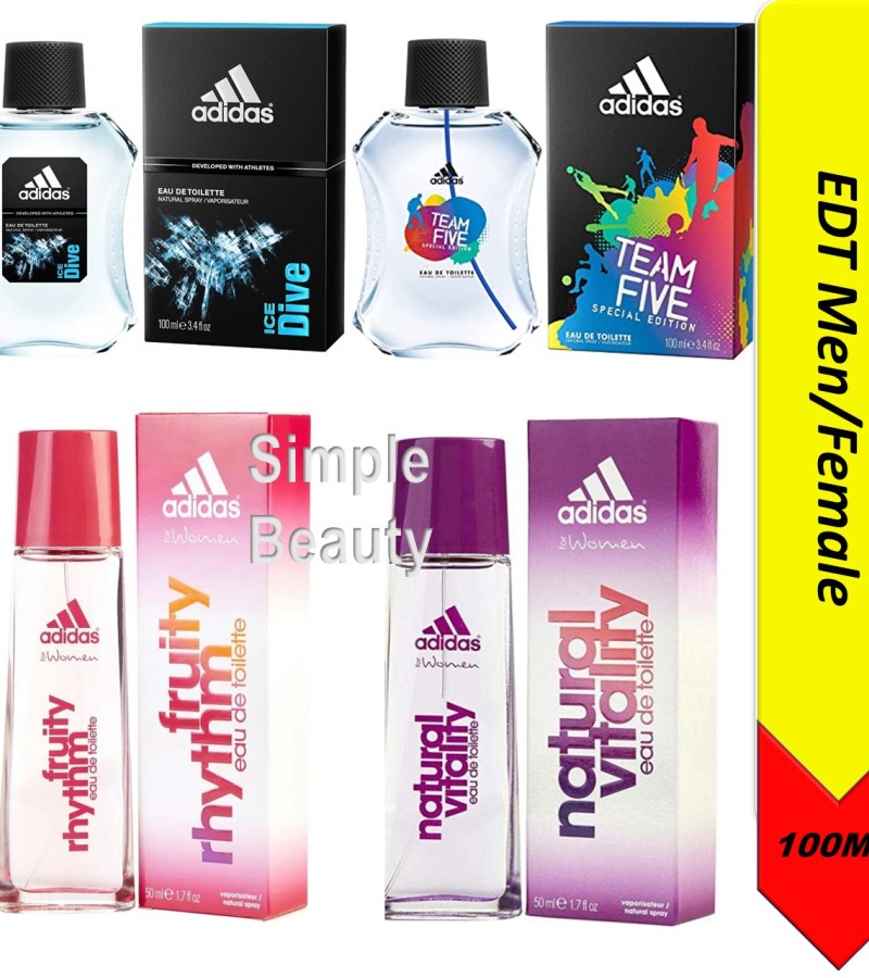 Get Ready Get Ready For Men by Adidas is a Woody Aromatic fragrance. Top notes are Sea Notes, Pineapple and Mandarin Orange. Middle notes are Exotic Fruits, Lavender and Clary Sage. Base notes are Cedar, Patchouli and Sandalwood. Ice Dive Ice Dive For Men by Adidas is a Aromatic Spicy fragrance. Top notes are Mint, Grapefruit, Lavender, Bergamot, Yuzu, Kiwi, Mandarin Orange and Anise. Middle notes are Geranium, Sandalwood and Patchouli. Base notes are Pepper, Ambergris, Musk, Vanilla and Tonka Bean. Pure Game Pure Game For Men by Adidas is a Woody Spicy fragrance. Top notes are Grapefruit, Basil, Mandarin Orange and Pepper. Middle notes are Cypress, Guaiac Wood and Lavender. Base notes are Tonka Bean, Sandalwood, Patchouli and Incense. Team Five Team Five For Men by Adidas is a Aromatic fragrance. Top notes are Green Apple, Lemon and Basil. Middle notes are Lavender, Mint, Sage and Pine Tree. Base notes are Benzoin and Amber. Team Force Team Force For Men by Adidas is a Aromatic fragrance. Top notes are Grapefruit, Orange, Mandarin Orange, Aldehydes and Pineapple. Middle notes are Juniper and Jasmine. Base notes are Tobacco, Sandalwood, Amber, Cedar and Musk. Victory League Victory League For Men by Adidas is a Amber Woody fragrance. Top Notes are Bergamot, Grass and Basil. Middle notes are Pear, Lavender and Pear. Base notes are Musk, Vanilla and Cedarwood.