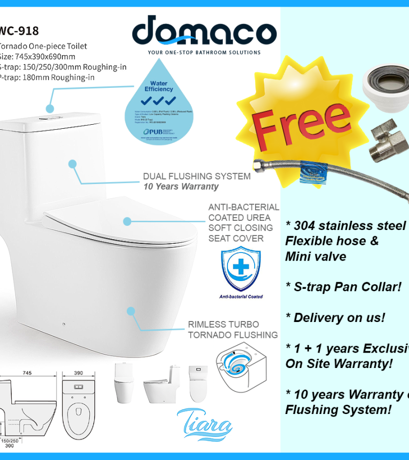 Tiara 918 Rimless Turbo Tornado Flushing 1-Piece Toilet Bowl with Slim Urea Seat Cover