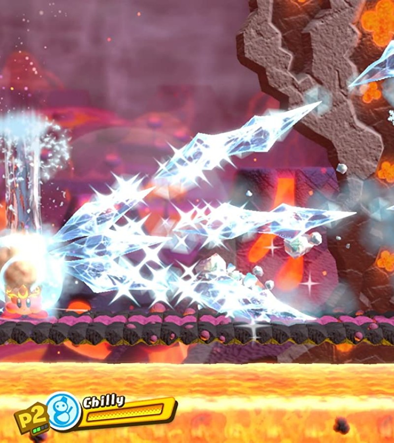 Float over obstacles and fight through enemies on your way to each stage’s goal as you slash, poke, freeze, and hammer using Kirby’s copy abilities.