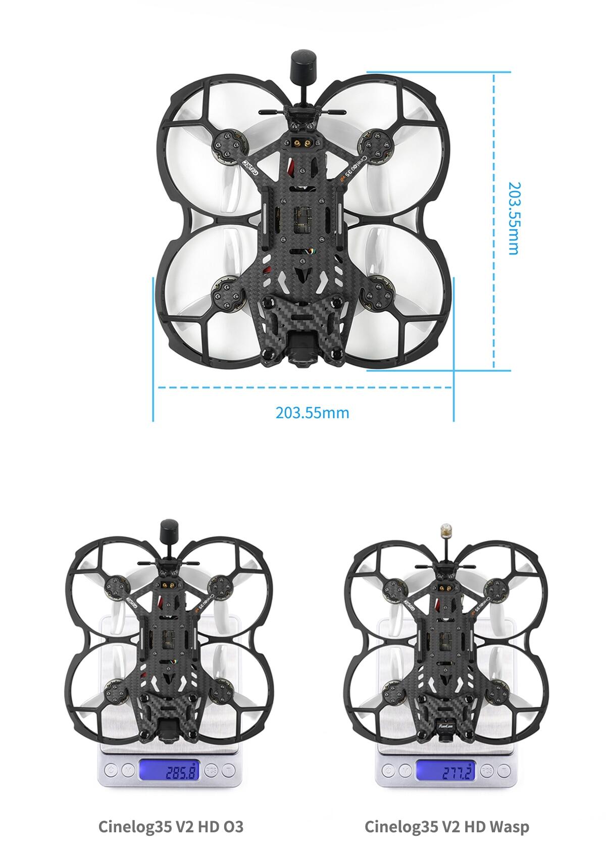 CineLog35 v2 version integrated with O3 VTX. The CineLog35 V2 version of the main carbon plate and injection protection frame increased the 7075 aluminum column for structural strengthening.